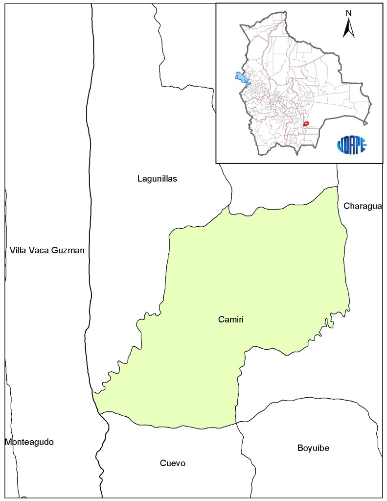 - El Municipio de Camiri limita al Norte con los Municipios de Lagunillas y Gutiérrez, al Sur con los municipios de Cuevo, al Este con el municipio de Charagua, al Noroeste con el municipio de Lagunillas, todas partes de la Provincia Cordillera y al Oeste con el municipio de Villa Vaca Guzmán Provincia Luis Calvo del Departamento de Chuquisaca.